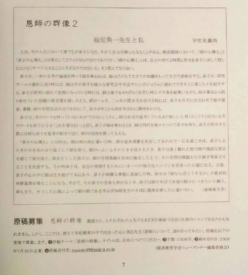 ![]() 2006年経済教育学会ニューズレターより引用 ![]() *・・恩師の群像2・・・* 板垣與一先生と私 宇佐見義尚 師弟関係において、「師の心構え」と「弟子の心構え」とは果たして どのようなものであろうか。 「師の心構え」とは、自分の持てる時間と労力を弟子に対して 惜しむことなくすべて与えることに尽きるのではないか、そう思えてならない。 弟子が、一本の自作の論説を持って師を尋ねれば、師は己のもてる全ての知識をもって 全力で添削をする。弟子が、研究テーマの選択の迷う時には、師はその弟子を 様々な研究会が学会やシンポジュウムに連れて行きそこに集う人々を紹介する。 弟子が研究に疲れて怠惰になっている時には、師はさりげなく自宅に呼んで 夕食を振る舞いながら、師が書店から取り寄せていた話題の最近著を貸し与える。 師が一ヶ月、二ヶ月の間自宅を空ける時には、弟子を自宅に住まわせて師の書斎、書籍 師の学問生活の全てをさらして、弟子がそこから何かを学ぶかに期待をかける。 弟子は、冬のコートを持っていないわけではない。 しかし、師は自分が愛用しているまだ新しい上等(カシミア100%)な 冬のコートを弟子に与え「これを着なさい」と言う。 弟子が師を尋ねる時、師は門灯を煌々とつけて弟子を待ち、 弟子が辞去する際には師は弟子を最寄の駅まで送り、帰りの切符を買って与える。 「弟子の心構え」とは何か。師が死の床に着いた時、師が延命措置を拒否して 水のみで一日を過ごせば、弟子もまたその日を水のみで過ごして師を思う。 師がいよいよそのときを迎えるとき、弟子は遠く離れた地での師の強固な意志を感じて 涙を流す。師を亡くした弟子は、師の学問業績を忠実に確定した上で、 その学問的課題を引き継ぎ発展させることを決意する。 その時弟子は、自分が飛翔するためにいまひとつ強力なエンジンを背負った心境になる。 以降、弟子の心の中に師は生き続けて共にあり、弟子が困難な事態に直面した時、 弟子は「師ならばどうするか」の絶対的判断基準を得ることになる。やがて、 その弟子の生命も終わるとき、弟子は師のそばで永遠の眠りにつきたいと願う。 師もまた、そうした心境によって師の師である中山伊知郎先生のそばに 墓地を移したに違いない。 (亜細亜大学) 板垣與一記念館:館長 宇佐見 義尚 拝 up date 2021.01.03 |