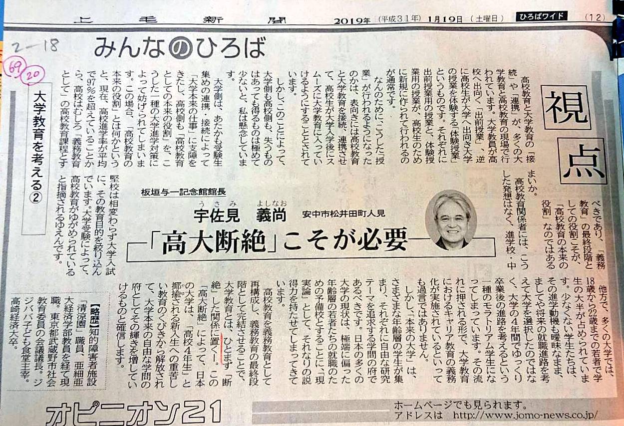 高校教育と大学教育の「接続」や「連携」が、多くの大学教育と高校教育の現場で行われています。 大学教員が高校へ出向く「出前授業」逆に高校生が大学へ出向き大学の授業を体験する「体験授業」というものです。 それぞれに出前授業用の授業と、体験授業用の授業が、高校生のために新規に作られて行われるのが通常です。 なんのために、こうした「授業」が行われるようになったのかは、表向きには高校教育と大学教育を接続、連携させて 高校生が大学入学後にスムーズに大学教育に入っていけるようにすることとされています。 しかし、このことによって、大学側も高校側も、失うものはあっても得るものは極めて少ないと、私は懸念しています。 大学側は、あたかも受験生集めの連携・接続によって「大学本来の仕事」に支障をきたし、高校側も 「高校教育としての本来の役割」をこうした一種の大学進学対策によって妨げられてしまいます。この場合、 「高校教育の本来の役割」とは何かというと、現在、高校進学率が平均で97%を超えていることから、高校はむしろ 「義務教育として」の高校教育課程とすべきであり、「義務教育」の最終段階としての役割こそが、 「高校教育の本来の役割」なのではあるまいか。 高校教育関係者には、こうした発想はなく、進学校・中堅校は相変わらず大学入試に、その教育目的を絞り込んでいます。 大学受験によって、高校教育がゆがめられていると指摘されるゆえんです。他方で、多くの大学では、 18歳から22歳までの若者で学生の大半が占められています。少なくない学生たちは、その進学動機も曖昧なまま、 ましてや将来の就職進路を考えて大学を選択したのではなく、大学の4年間でゆっくり卒業後の進路を考えるという 一種のモラトリアム学生になってしまっています。その流れに押される形で、大学教育におけるキャリア教育の義務化が 実施されているといっても過言ではありません。 しかし、「本来の大学」は、さまざまな年齢層の学生が集まり、それぞれに自由な研究テーマを追求する 学問の府であるべきです。日本の多くの大学の現状は、極端に偏った年齢層の若者たちの就職のための予備校とすることに、 「現実論」として、それなりの説得力を持たせてしまってきています。 高校教育を義務教育として再構成し、義務教育の最終段階として完結させることで、大学教育とは、ひとまず「断絶」した関係に置く―。 この「高大断絶」によって、日本の大学は、「高校4年生」と揶揄(やゆ)される新入生への 重苦しい教育のくびきから解放されて、大学本来の自由な学問の府としてその輝きを増していけるものと確信します。 板垣與一記念館館長 宇佐見義尚 安中市松井田町人見 【略歴】知的障害者施設「清涼園」職員、亜細亜大経済学部教員を経て現職。 東京都武蔵野市社会教育委員の会議議長。ジジババ子ども食堂主宰。高崎経済大卒。 2019/01/19掲載 |
