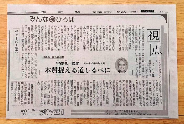 https://www.jomo-news.co.jp/feature/shiten/132785![]() ドイツの社会科学者マックス・ヴェーバー(1864~1920年)研究が、近年再び活発になっています。ドイツ語圏はもとより、英語圏、日本語圏でのヴェーバー研究は、第2次ヴェーバー・ルネサンスと呼んでも良いかと思われます。 生誕100年にあたる64年前後の第1次ルネサンスを経て、76年に『ヴェーバー全集』の編集委員会がミュンヘンのバイエルン科学アカデミーに設置され、84年に第1回の配本が開始されました。全集は最終的には3部構成43巻全54冊で、2019年現在、残り2冊を残してまもなく配本を完結する予定です。 全集の出版事業そのものが、独自な編集理念と方針を含めて、構想から完結までに43年余りをかけたドイツ社会科学界の一大金字塔であることに間違いはありません。 さて、ヴェーバーは、日本の学界においても経済学、社会学、政治学、歴史学、宗教学、学問論(社会科学方法論)を学ぶ上で避けて通れない「知の巨人」の1人としてその地位は今なお揺るぎがありません。一般にも日本の政治家が時々「職業としての学問」「職業としての政治」というヴェーバーによる講演(1919年)録の一節を引用することで知られています。 ヴェーバーの研究業績の中心は、ヨーロッパに特有な「近代資本主義」を文明論としてその本質を解き明かしたことにあります。ヴェーバーの研究が、なぜ、現代の日本においてもそれほど熱心に関心を持たれて研究されるのか。日本人である私がなぜ、150年も前の、しかも遠いヨーロッパ社会に生きたヴェーバーを研究するのか。その理由は、ヴェーバーによる「近代資本主義」の研究が、私が生きる日本の「現代資本主義」の本質を突き止めるための方法論として、不可欠な研究であると考えるからなのです。 日本の現代資本主義の文明論的本質をヴェーバー的に理解することなしに、日本の「現実」を「ありのままに」に捉え、そこから生じているさまざまな社会的問題や課題を解決する実践的な対策は立てられません。 私がヴェーバー研究に取り組むきっかけは、板垣與一(1908~2003年)に師事して最初に与えられたドイツ語原書講読のテキストがヴェーバーの「社会科学および社会政策認識の客観性」であったことに始まります。 そこには、「知的誠実性」「職業倫理」「禁欲」「合理性」「真の勇気」を修めた人間類型の体現がありました。また、ヴェーバーが実際に生きた時代の問題にどのように立ち向かったのか、日常に埋没することなく、日常から逸脱することなく、現実の緊張の中に生きる、その「生きざま」の中から、私は「情熱」「ひらめき」「明晰(めいせき)」を私の人生の指針とすることを決めたのでした。 板垣與一記念館館長 宇佐見義尚 安中市松井田町人見 【略歴】知的障害者施設「清涼園」職員、亜細亜大経済学部教員を経て現職。 東京都武蔵野市社会教育委員の会議議長。ジジババ子ども食堂主宰。高崎経済大卒。 2019/05/20 掲載 |