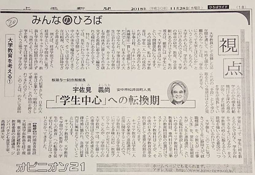 https://www.jomo-news.co.jp/feature/shiten/95563![]() 大学教員として在籍した35年間を通じて、片時も頭から離れなかったことは、「学生にとって大学とはなにか」 ということでした。もちろん、大学そのものは、学生のためにだけあるのではなく、大学の使命が研究、教育、社会貢献に あるわけですから、先の視点は、厳密には「学生にとって、大学教育とはなにか」という問題提起になります。 その結論を、私は「大学教育は、学生一人一人の成長のためにある」との理念のもとに学事日程、 カリキュラムの再構築を一貫して提唱してきたのでした。日本の多くの大学では今なお、学事日程は学生に合わせるよりも 大学側の都合に合わせ、カリキュラムも学問体系に即してそれを研究する教員に都合よく編成される傾向にあるからです。 特に、カリキュラムについては、長年にわたって日本の大学では学問(ディシプリン)中心の体系で 編成されてきているのでそこでは学生の存在は軽視、ないしは排除せざるを得ません。例えば、経済学部ですと、 経済学という学問体系に基づくカリキュラムが作られ、教員も学生も何の疑問を持たずに、当然のように 教員は経済学を教え、学生は経済学を学ぶという立場です。学生がなんのために経済学を学ぶのかの 根本的動機付けを深める視点が弱く、また経済学を学生が成長していくための「手段」として学び取るという発想はほとんど見られません。 その結果として、日本の大卒者は企業から「即戦力として使えない」との烙印(らくいん)を押されてきたのでした。 このことは、のちに文部科学省によって「学生に何を教えるのかではなく、学生が何をできるようになるか」を 大学教育の核心に据えるという提唱を強いられる要因の一つになっているわけです。 大学側も、このことに気づき、2001年に静岡大が「就職概論」を、立教大が「仕事と人生」を、 翌年には亜細亜大が「人生と進路選択」という正規科目を新設しました。いわゆるキャリア教育科目が教養科目、 専門科目と並ぶ第3の教育科目群の位置付けでスタートしたのでした。このキャリア教育科目こそが、 その後の日本の大学教育改革全般の要として重要な役割を担うことになります。 キャリア教育とは学生一人一人の卒業後の進路選択に、直接に関係することなので、 大学教育における学生個々人に対する多様な対応(教育プログラム)が不可欠になります。ところが、 「学問中心の大学教育」では、学生個々人の事情は ほとんど考慮されることはないので、学生は強い疎外感に襲われ、急速に授業内容に興味をなくしていくことになります。 キャリア教育が、大学教育を「学問中心の教育」から「学生中心の教育」への転換を促す 切り札になることがはっきりと分かってきました。 板垣與一記念館館長 宇佐見義尚 安中市松井田町人見 【略歴】知的障害者施設「清涼園」職員、亜細亜大経済学部教員を経て現職。 東京都武蔵野市社会教育委員の会議議長。ジジババ子ども食堂主宰。高崎経済大卒。 2018/11/28掲載 |