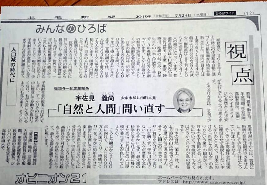 https://www.jomo-news.co.jp/feature/shiten/148020![]() 総務省が、2019年1月1日時点の住民基本台帳に基づく人口動態調査の結果を発表しました。国内の日本人は1億2477万6364人で前年より43万3239人の減少。群馬県は192万4605人で前年より1万2471人の減少になっています。都道府県別では人口減がない自治体は埼玉、千葉、東京、神奈川、沖縄の五つのみ。18年生まれの日本人は92万1000人で、3年連続100万人を割っています。しかも65歳以上の割合は28%に上昇。まさしく少子高齢社会の現実です。 日本の総人口は、明治元年にあたる1868年の3400万人から増え続け、1967年に1億人を超えたとされます。冒頭の調査では、日本人は2009年の1億2707万人をピークに減少傾向に転じています。国連人口部によれば、日本の人口は2100年には7500万人になると推測されています。 政界の大方は、人口減少に対しては国力維持の観点から最低でも1億人を政策課題としてあげます。財界では、一定の経済規模確保の観点からこれ以上の人口減少は避けたいとの主張が大勢を占めています。そして一般的には、少子高齢社会が直面しているさまざまな社会的課題(子育て、教育、雇用、働き方、年金問題、社会保障、高齢者福祉、医療)へのマイナスイメージや漠然とした不安が先行しているように思えます。 そのありさまは、まるで少子高齢社会の現実におぼれてしまい、すっかりその日常の中に埋没して身動きが取れなくなり、もがき苦しんでいるようにも見えます。そうした思考状況の中からは、容易に斬新な発想は期待できませんし、ましてや百年の計はとうていおぼつきません。 そこで少子高齢社会の現実に埋没もせず逸脱もしないギリギリのところで、日本における「自然と人間社会」のあり方という第三の観点から、日本の少子高齢社会、人口減少について、再検討してみてはどうかというのが私の提言です。 日本の自然(国土)は、およそ80%が山岳地帯で人の住める里は20%に過ぎません。そうした国土の日本では、自然に負荷をかけずに、つまり「山を崩さず、空や川を汚さない」で、人々が歴史や文化をおろそかにせず、最先端の科学に支えられて快適に暮らすために、どれほどの人口規模で暮らすことが良いのでしょうか。 こうした観点から2100年に向けて、「人口8000万人の国づくり・地域づくり」を、今から80年をかけて緻密に計画していくことを提案します。少子高齢社会という現実を私たちはどのように受け止めて、将来に生かしていけるのか―。こうした少子高齢社会に対する大局的な観点こそが、今の私たちにとって、最も必要な課題であるように思います。 板垣與一記念館館長 宇佐見義尚 安中市松井田町人見 【略歴】知的障害者施設「清涼園」職員、亜細亜大経済学部教員を経て現職。 東京都武蔵野市社会教育委員の会議議長。ジジババ子ども食堂主宰。高崎経済大卒。 2019/07/24掲載 |