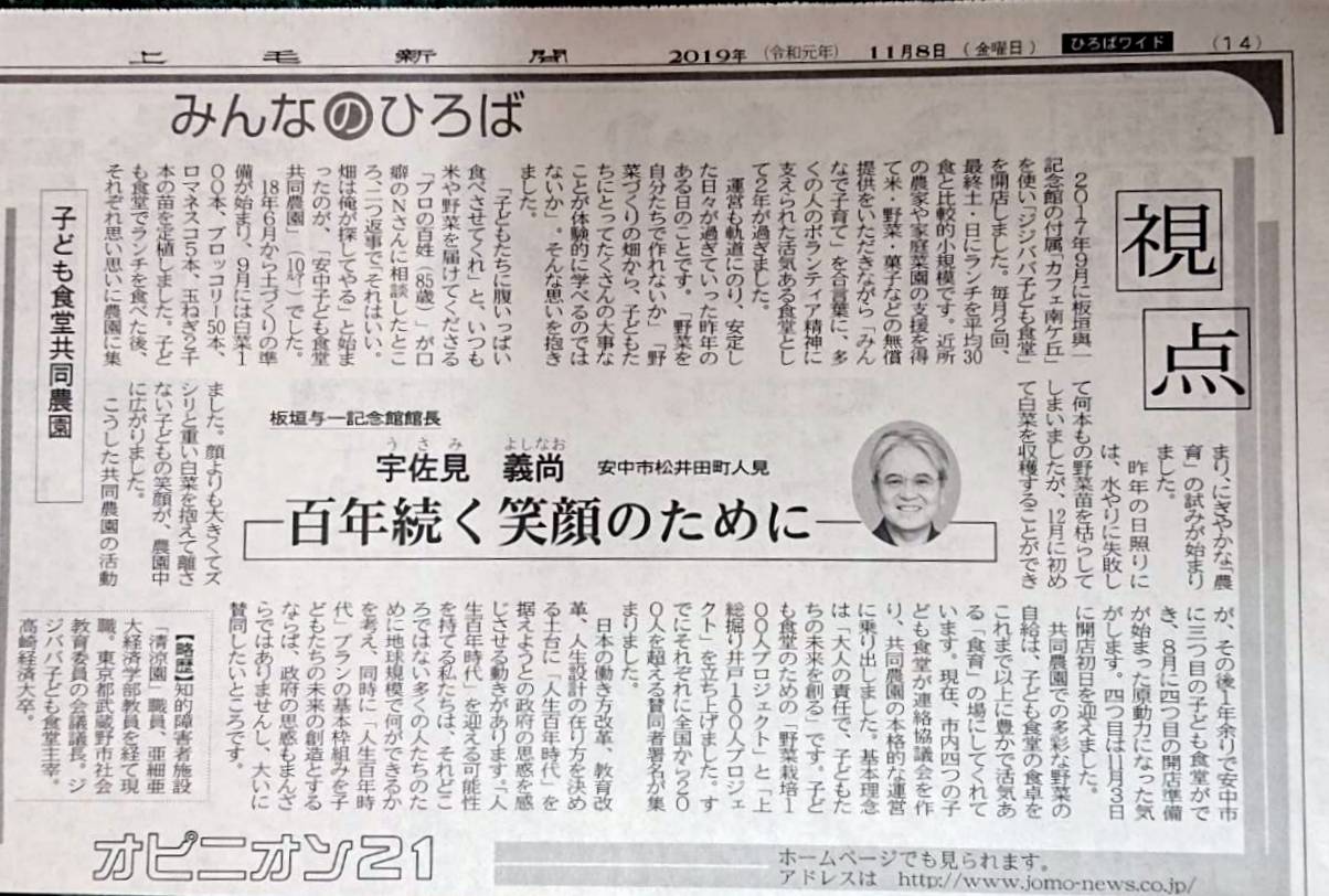 https://www.jomo-news.co.jp/feature/shiten/172059![]() 2017年9月に板垣與一記念館の付属「カフェ南ケ丘」を使い「ジジババ子ども食堂」を開店しました。毎月2回、最終土・日にランチを平均30食と比較的小規模です。近所の農家や家庭菜園の支援を得て米・野菜・菓子などの無償提供をいただきながら「みんなで子育て」を合言葉に、多くの人のボランティア精神に支えられた活気ある食堂として2年が過ぎました。 運営も軌道にのり、安定した日々が過ぎていった昨年のある日のことです。「野菜を自分たちで作れないか」「野菜づくりの畑から、子どもたちにとってたくさんの大事なことが体験的に学べるのではないか」。そんな思いを抱きました。 「子どもたちに腹いっぱい食べさせてくれ」と、いつも米や野菜を届けてくださる「プロの百姓(85歳)」が口癖のNさんに相談したところ、二つ返事で「それはいい。畑は俺が探してやる」と始まったのが、「安中子ども食堂共同農園」(10アール)でした。 18年6月から土づくりの準備が始まり、9月には白菜100本、ブロッコリー50本、ロマネスコ5本、玉ねぎ2千本の苗を定植しました。子ども食堂でランチを食べた後、それぞれ思い思いに農園に集まり、にぎやかな「農育」の試みが始まりました。 昨年の日照りには、水やりに失敗して何本もの野菜苗を枯らしてしまいましたが、12月に初めて白菜を収穫することができました。顔よりも大きくてズシリと重い白菜を抱えて離さない子どもの笑顔が、農園中に広がりました。 こうした共同農園の活動が、その後1年余りで安中市に三つ目の子ども食堂ができ、8月に四つ目の開店準備が始まった原動力になった気がします。四つ目は11月3日に開店初日を迎えました。 共同農園での多彩な野菜の自給は、子ども食堂の食卓をこれまで以上に豊かで活気ある「食育」の場にしてくれています。現在、市内四つの子ども食堂が連絡協議会を作り、共同農園の本格的な運営に乗り出しました。基本理念は「大人の責任で、子どもたちの未来を創る」です。子ども食堂のための「野菜栽培100人プロジェクト」と「上総掘り井戸100人プロジェクト」を立ち上げました。すでにそれぞれに全国から200人を超える賛同者署名が集まりました。 日本の働き方改革、教育改革、人生設計の在り方を決める土台に「人生百年時代」を据えようとの政府の思惑を感じさせる動きがあります。「人生百年時代」を迎える可能性を持てる私たちは、それどころではない多くの人たちのために地球規模で何ができるかを考え、同時に「人生百年時代」プランの基本枠組みを子どもたちの未来の創造とするならば、政府の思惑もまんざらではありませんし、大いに賛同したいところです。 板垣與一記念館館長 宇佐見義尚 安中市松井田町人見 【略歴】知的障害者施設「清涼園」職員、亜細亜大経済学部教員を経て現職。 東京都武蔵野市社会教育委員の会議議長。ジジババ子ども食堂主宰。高崎経済大卒。 2019/11/08掲載 |