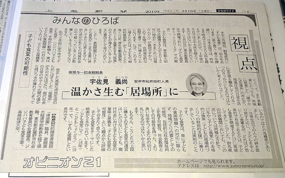 本年2月現在、群馬県内に「子ども食堂」が、43カ所あります(県子育て・青少年課調べ)。 日本全国では、昨年4月時点で2200カ所を超えていましたので、1年後の今日では3000カ所を 超えているのではないかと言われています(2月10日に東京都豊島区で開催された「子ども食堂サミット2019」での報告)。 子ども食堂は、東京都大田区で近藤博子さんが2012年に始めた「きまぐれ八百屋だんだん」が最初ですから、 この7年間で、自然発生的な民間主導で一気に増えたことになります。なぜ、このように増えたのかは、 子どもの「相対的貧困率」が7人に1人と高く(15年、厚生労働省調査)、また1人で食事をする 「孤食」の子どもが増えていることが主な要因として挙げられています。 しかし、貧困問題だけで子ども食堂がここまで急激に普及してきたとは思えません。 別な何かが私たちの地域社会の中で起こっていることが影響しているように思えてなりません。 私が、2年前に安中市で「子ども食堂」(ジジババ子ども食堂を始めた動機も、 実は子どもの貧困問題への対応というよりは、子どもと保護者にとって、また高齢者にとっても、 地域に根差した「緩やかな居場所」の存在が、地域住民の日常生活に安定感を醸成してくれる 一つのきっかけになるのではないかと考えたからでした。 安定した高度な市民生活のためにはそうした「居場所」が不可欠なほどに、現代社会の日常の中で 人々の間の温かな結びつきが薄れてしまっているのではとの危機感がありました。 日常生活での人々の絆を取り戻すために、子どもを中心にした食事会が、どれほど効果的で有益であるかは 子ども食堂を開催するたびに実感してきたことでした。群馬県の行政機関においても、この点については同様な方針で、 17年から子ども食堂への本格的な施策(子どもの居場所づくりへの財政的支援)に乗り出していることは周知のことです。 子ども食堂は、単に子どもの貧困問題への対応に限らず、地域づくりの要としての可能性、包括的な社会福祉向上を 促す可能性、社会教育としての可能性を持った、より良い社会をつくるための切り札になるのではないかと思います。 もちろん、こうした大上段に構えての子ども食堂の運営はいただけないにしても、現代社会における子ども食堂の 意味と意義を「子ども食堂の可能性」という観点から評価しておきたく思うのです。 子ども食堂をテーマにした映画が2本作られています。 「こども食堂にて」(18年)と「こどもしょくどう」(19年)で、いずれも推薦したい秀作です。 板垣與一記念館館長 宇佐見義尚 安中市松井田町人見 【略歴】知的障害者施設「清涼園」職員、亜細亜大経済学部教員を経て現職。 東京都武蔵野市社会教育委員の会議議長。ジジババ子ども食堂主宰。高崎経済大卒。 2019/03/16 掲載 |